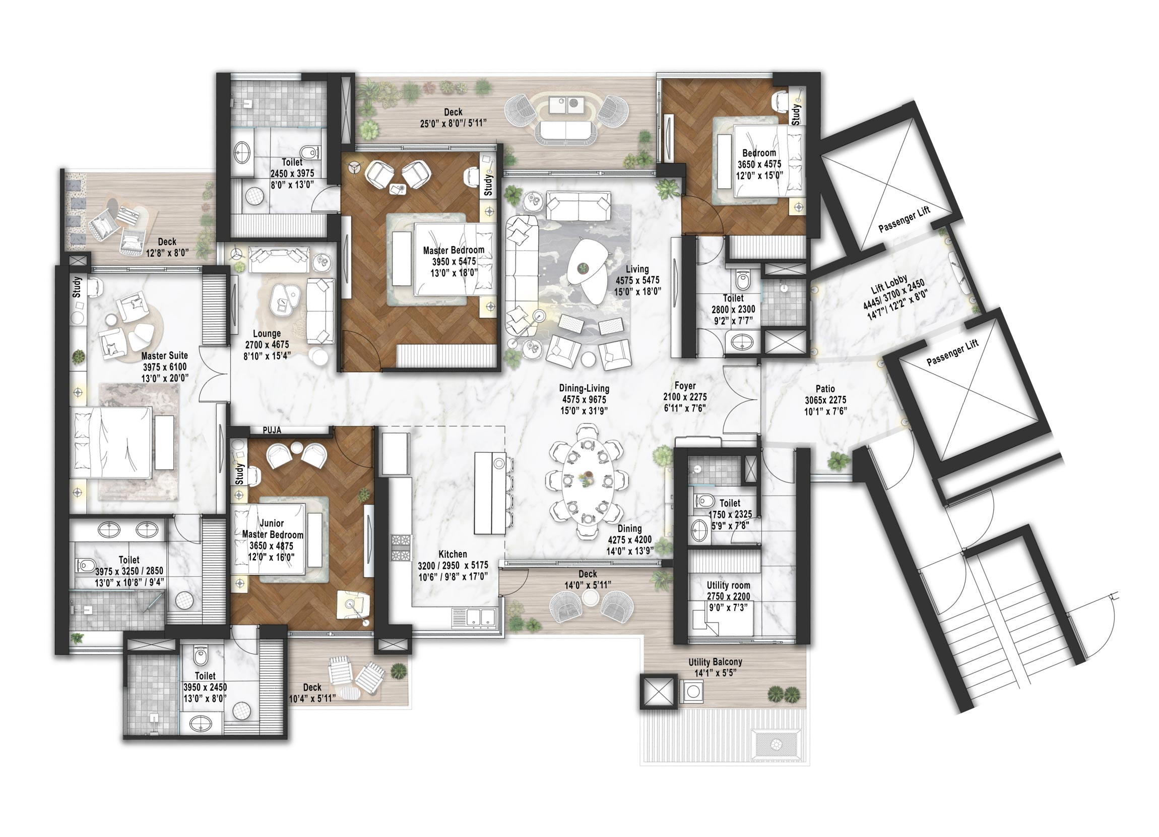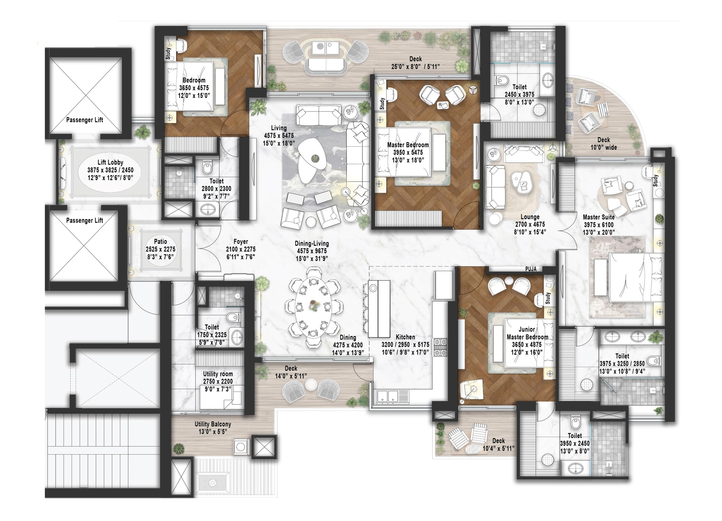The homes at Elan The Statement are designed for everyday comfort with a focus on spacious living. Predominantly offering large 4 BHK apartments and penthouses with generous floor areas (around 4,000 sq ft and above), these residences feature well-planned layouts that support natural light, cross-ventilation, and privacy, aspects that matter most to families and long-term residents. Thoughtful details like high ceilings, open balconies, and efficient internal planning make daily life more usable and comfortable rather than just visually striking.